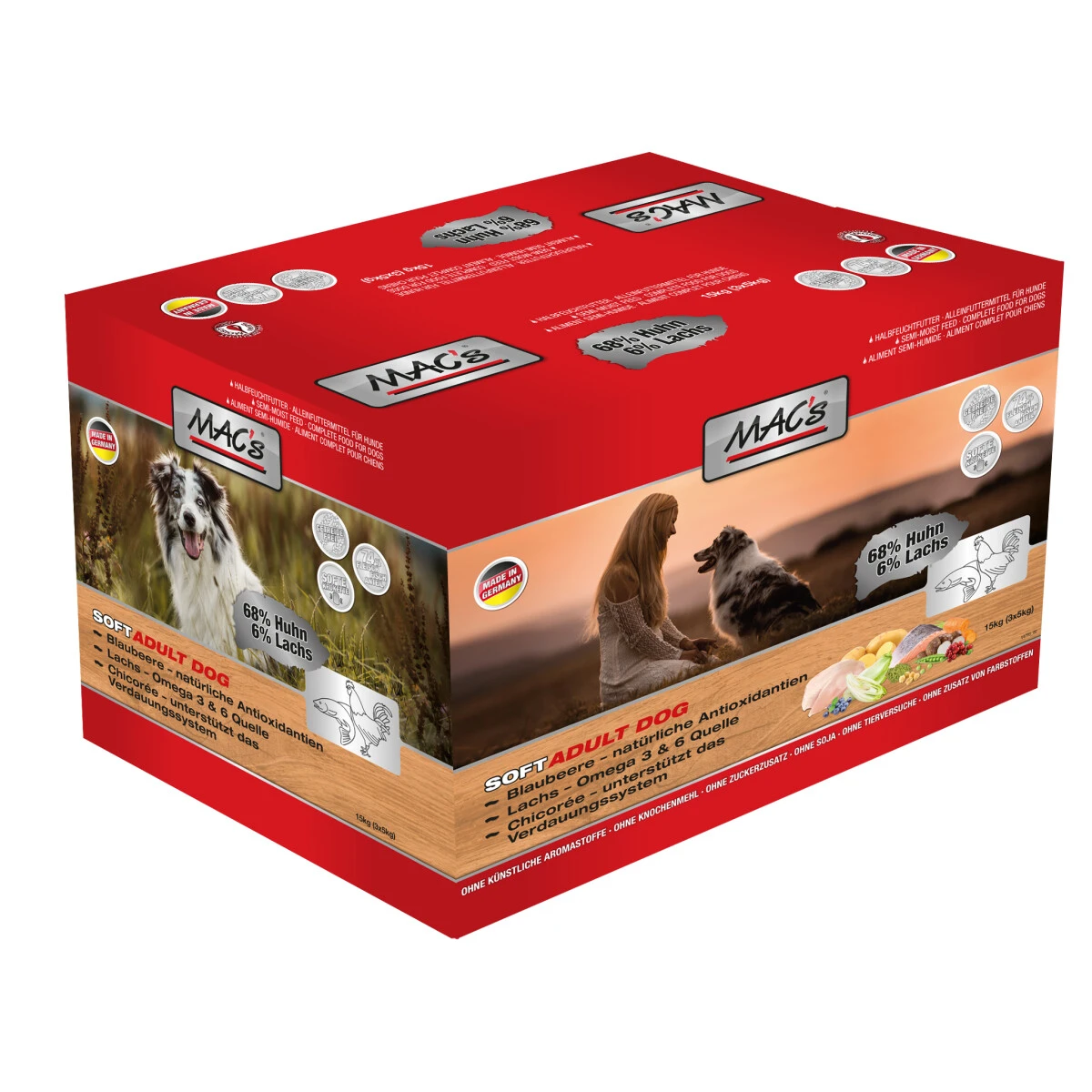 Der Hundefreund hat heute die Wahl zwischen Feucht- / Dosennahrung und Trockennahrung. Macs SOFT Huhn hingegen wurde als Halbfeuchtfutter mit einem sehr hohen Fleischanteil entwickelt.