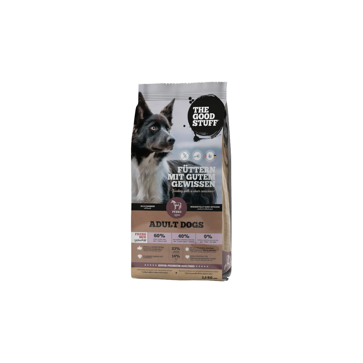 „PFERD“ ist ein getreidefreies Single Protein Trockenfutter in bewährter Super Premium-Qualität von THE GOODSTUFF. Pferdefleisch ist sehr leicht vertäglich, fettarm, reich an wertvollen Vitaminen und Nährstoffen und optimal geeignet für ernährungssensible Hunde. Unser Hunde-Trockenfutter wird schonend hergestellt, enthält frisches Pferde-Muskelfleisch, Amaranth mit niedrigem glykämischen Index, regional verfügbares Obst & Gemüse sowie ausgewählte Kräuter. „PFERD“ (Adult) ist ein Alleinfuttermittel für Hunde aller Rassen und Größen.